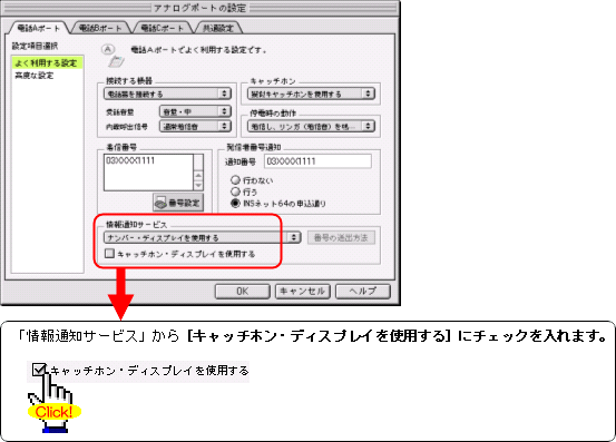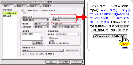 注:FAXやモデムを接続したポートには、キャッチホンを設定しないでください。通信中に割込音が入ると、通信エラーとなります。