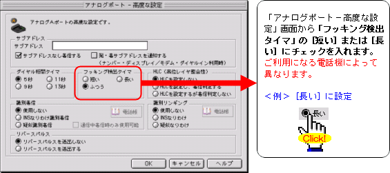 フッキングがうまく働かないとき(キャッチホンの切り替えができないときなど)は、以下の手順でフッキング検出タイマを調整してください。