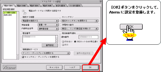 注:FAXやモデムを接続したポートには、キャッチホンを設定しないでください。通信中に割込音が入ると、通信エラーとなります。