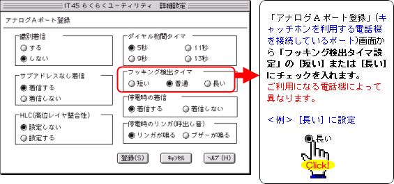 フッキングがうまく働かないとき(キャッチホンの切り替えができないときなど)は、以下の手順でフッキング検出タイマを調整してください。