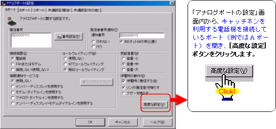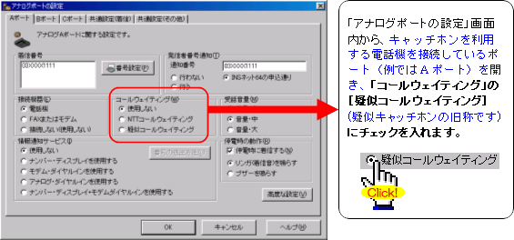 注:FAXやモデムを接続したポートには、キャッチホンを設定しないでください。通信中に割込音が入ると、通信エラーとなります。