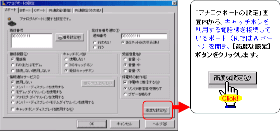 注:FAXやモデムを接続したポートには、キャッチホンを設定しないでください。通信中に割込音が入ると、通信エラーとなります。