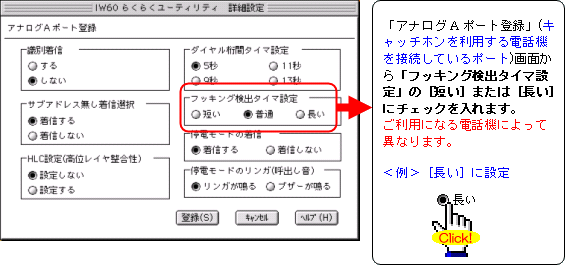 フッキングがうまく働かないとき(キャッチホンの切り替えができないときなど)は、以下の手順でフッキング検出タイマを調整してください。