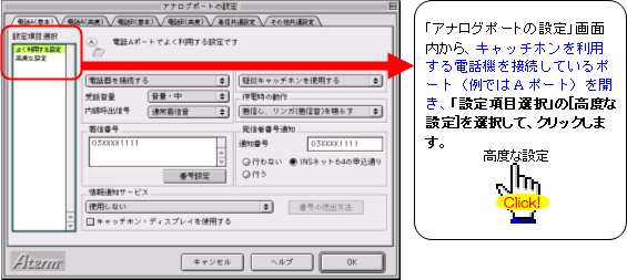 注:FAXやモデムを接続したポートには、キャッチホンを設定しないでください。通信中に割込音が入ると、通信エラーとなります。