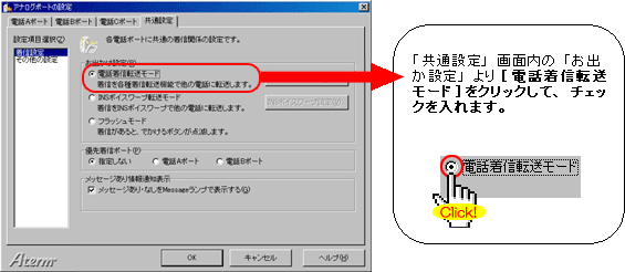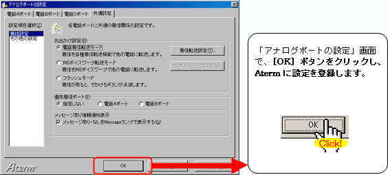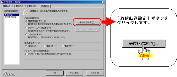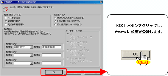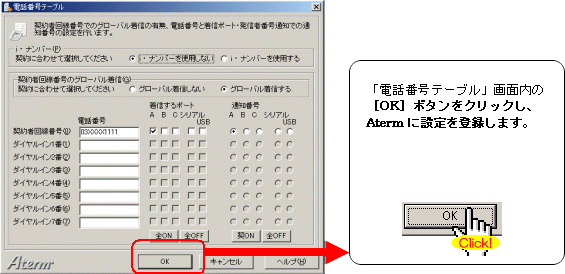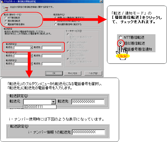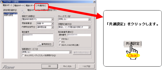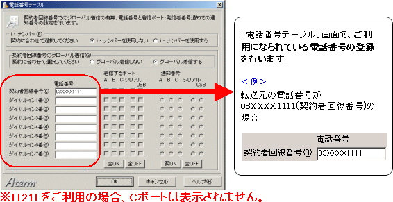 本画面では、事例として次のような設定方法を記載しています。 設定する際には、ご利用になる環境に読み替えて、実際にご利用の電話番号にて設定をしてください。 (i・ナンバー、INSダイヤルインサービスをご利用の方は、各サービスの設定方法を合わせてご参照ください)