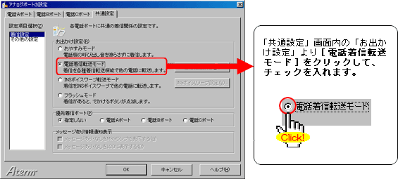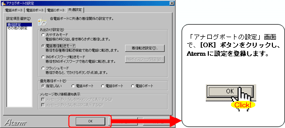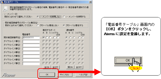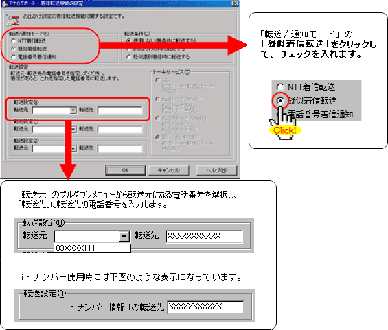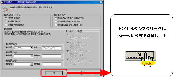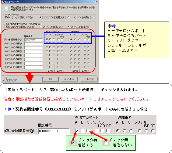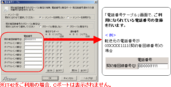 本画面では、事例として次のような設定方法を記載しています。 設定する際には、ご利用になる環境に読み替えて、実際にご利用の電話番号にて設定をしてください。 (i・ナンバー、INSダイヤルインサービスをご利用の方は、各サービスの設定方法を合わせてご参照ください)