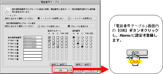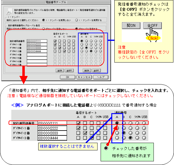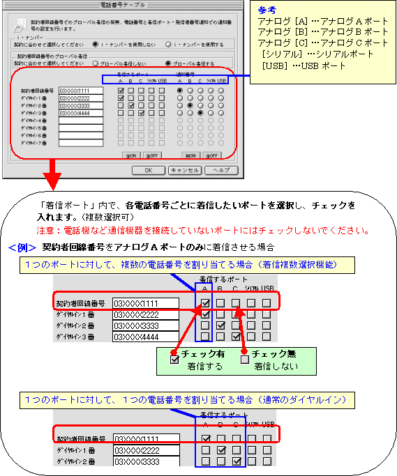 本画面では、事例として次のように電話番号を割り振る設定方法を記載しています。 設定する際には、ご利用になる環境に読み替えて、実際にご利用の電話番号にて設定してください。
