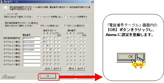 本画面では、事例として次のように電話番号を割り振る設定方法を記載しています。 設定する際には、ご利用になる環境に読み替えて、実際にご利用の電話番号にて設定してください。
