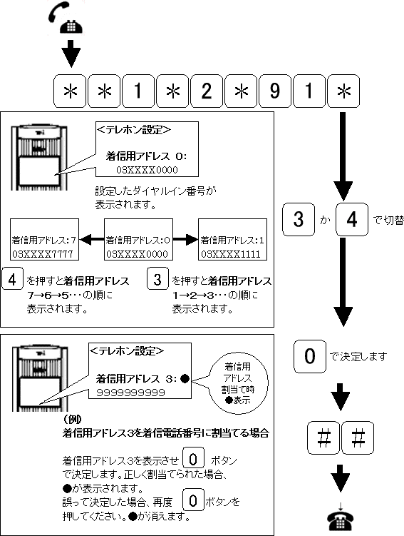 契約者回線番号(着信用アドレス0)・ダイヤルイン番号1~7(着信用アドレス1~7)を着信させる設定をします