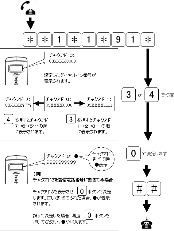 契約者回線番号(チャクアド0)・ダイヤルイン番号1~7(チャクアド1~7)を着信させる設定をします。