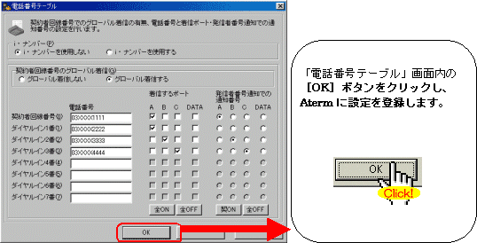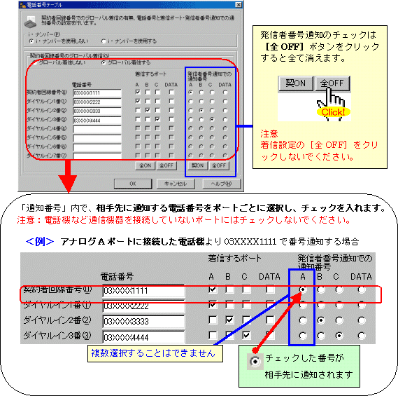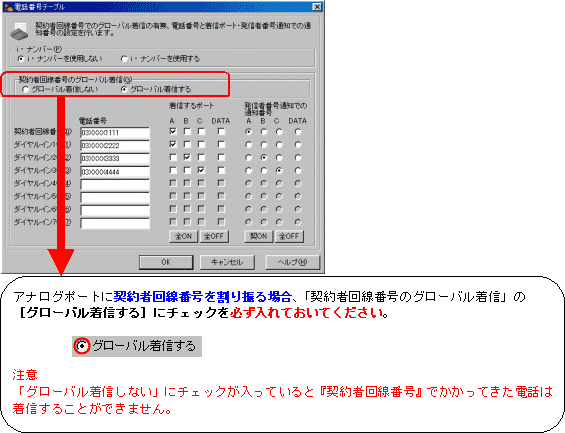 本画面では、事例として次のように電話番号を割り振る設定方法を記載しています。 設定する際には、ご利用になる環境に読み替えて、実際にご利用の電話番号にて設定してください。