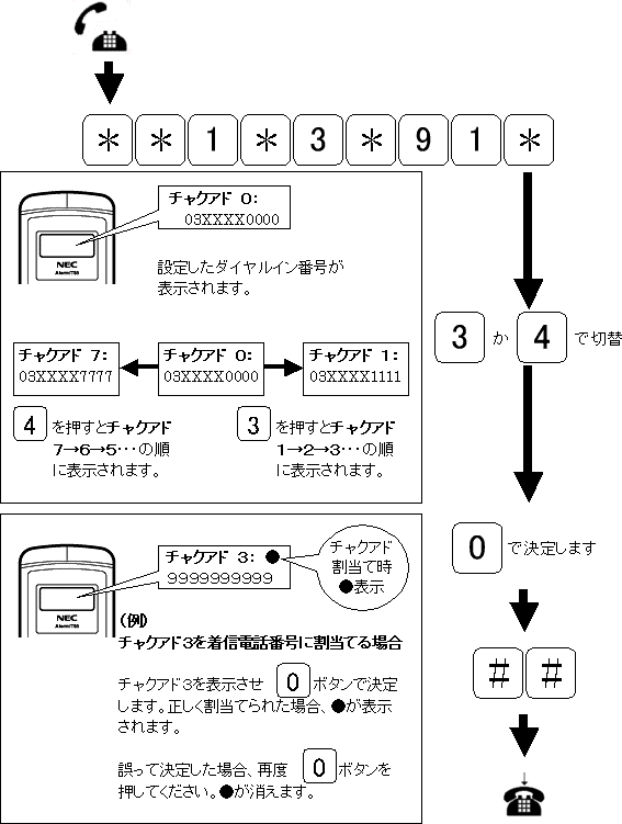 契約者回線番号(チャクアド0)・ダイヤルイン番号1~7(チャクアド1~7)を着信させる設定をします