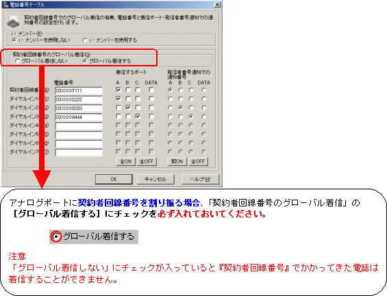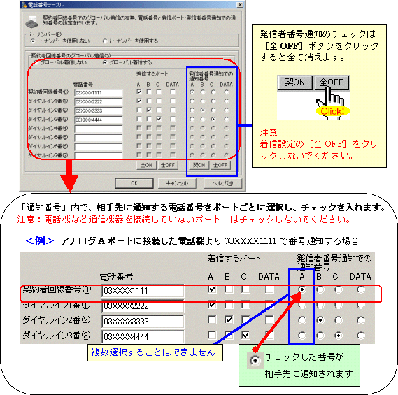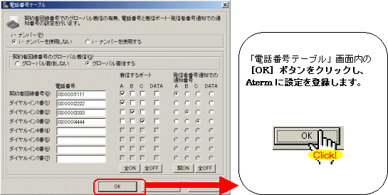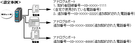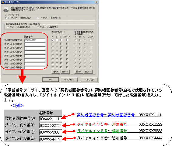 本画面では、事例として次のように電話番号を割り振る設定方法を記載しています。 設定する際には、ご利用になる環境に読み替えて、実際にご利用の電話番号にて設定してください。