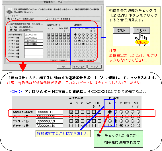 本画面では、事例として次のように電話番号を割り振る設定方法を記載しています。 設定する際には、ご利用になる環境に読み替えて、実際にご利用の電話番号にて設定してください。