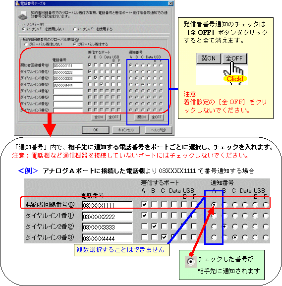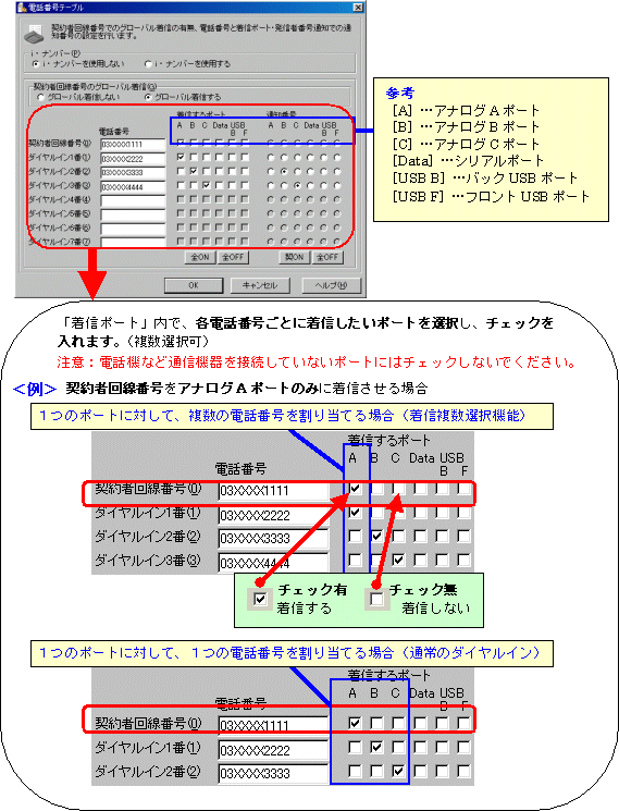 本画面では、事例として次のように電話番号を割り振る設定方法を記載しています。 設定する際には、ご利用になる環境に読み替えて、実際にご利用の電話番号にて設定してください。