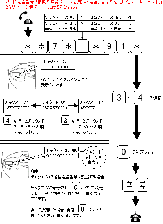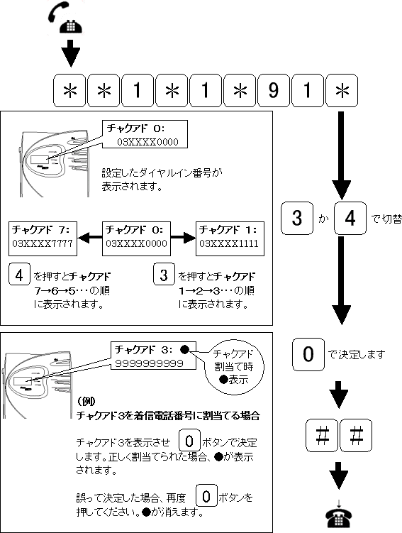 契約者番号(チャクアド0)・ダイヤルイン番号1~7(チャクアド1~7)を着信させる設定をします。