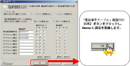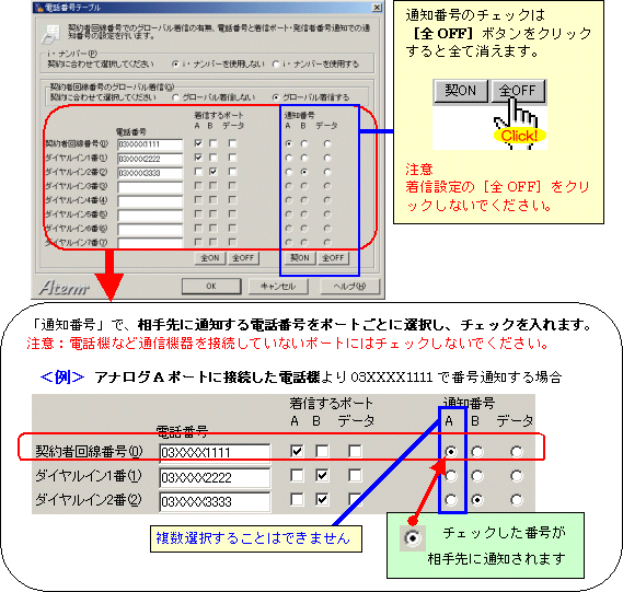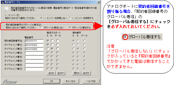 本画面では、事例として次のように電話番号を割り振る設定方法を記載しています。 設定する際には、ご利用になる環境に読み替えて、実際にご利用の電話番号にて設定してください。