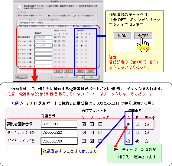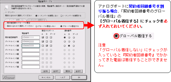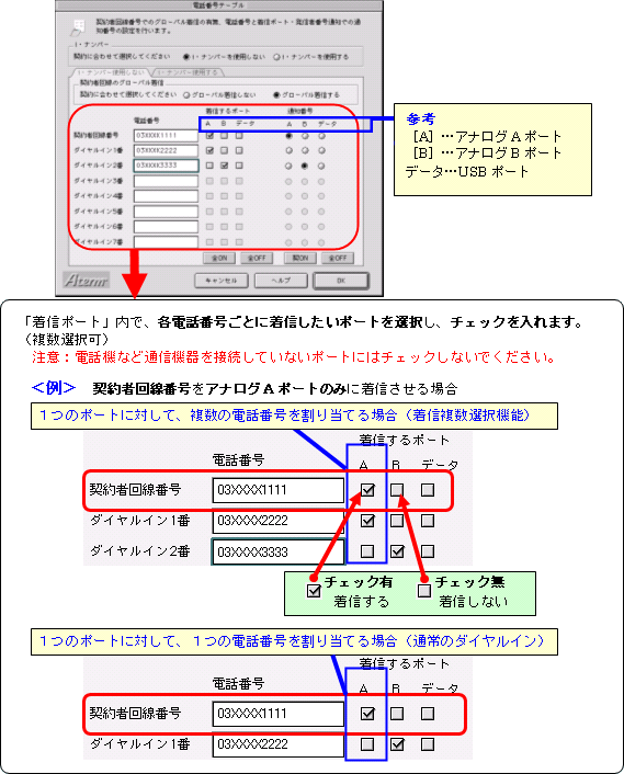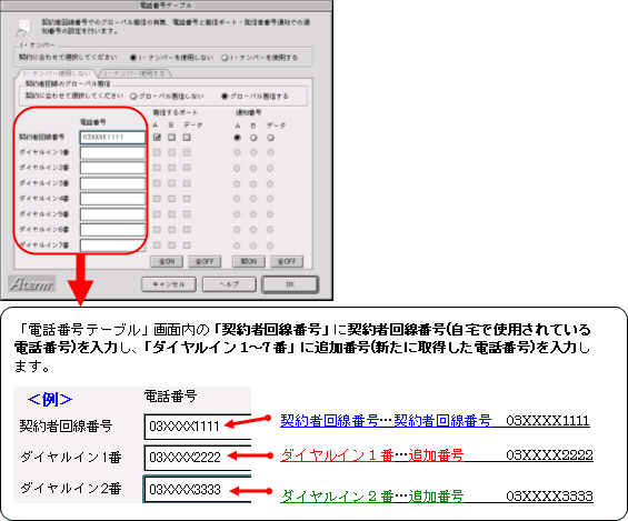 本画面では、事例として次のように電話番号を割り振る設定方法を記載しています。