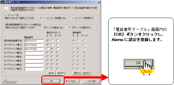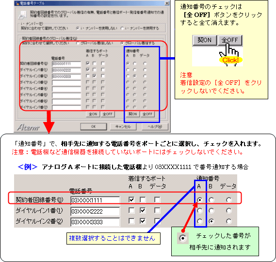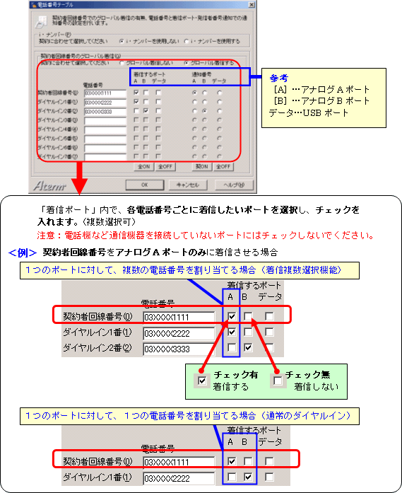 本画面では、事例として次のように電話番号を割り振る設定方法を記載しています。