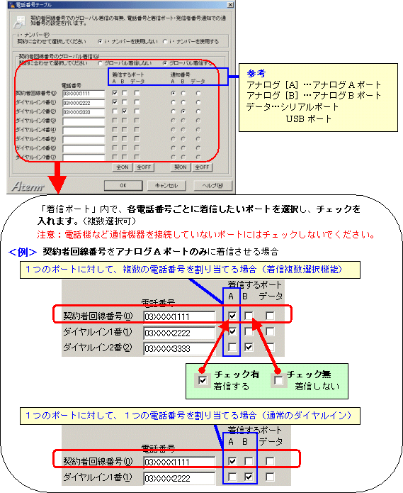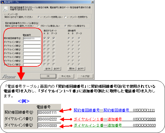 本画面では、事例として次のように電話番号を割り振る設定方法を記載しています。