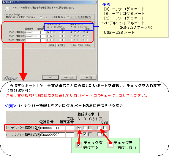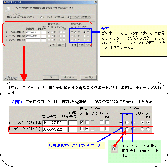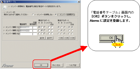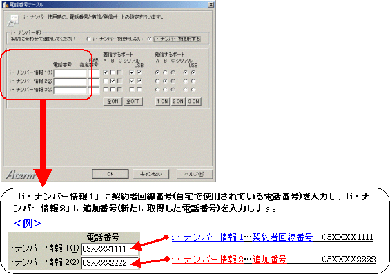 本画面では、事例として次のように電話番号を割り振る設定方法を記載しています。 設定する際には、ご利用になる環境に読み替えて、実際にご利用の電話番号にて設定してください。