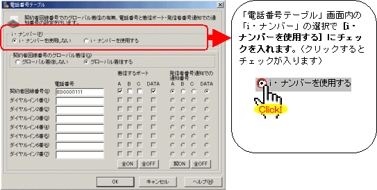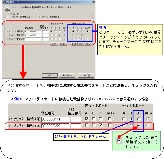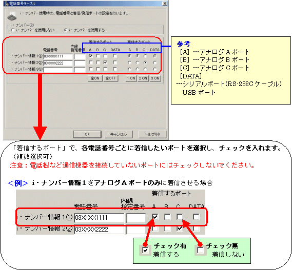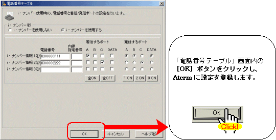 本画面では、事例として次のように電話番号を割り振る設定方法を記載しています。 設定する際には、ご利用になる環境に読み替えて、実際にご利用の電話番号にて設定してください。