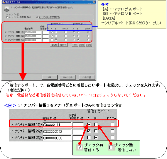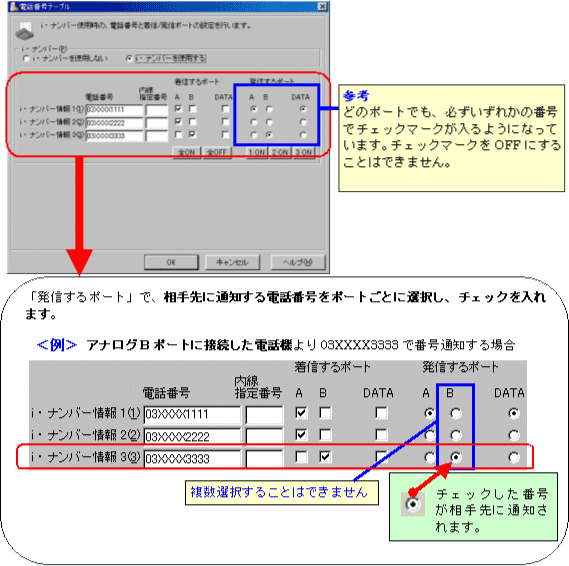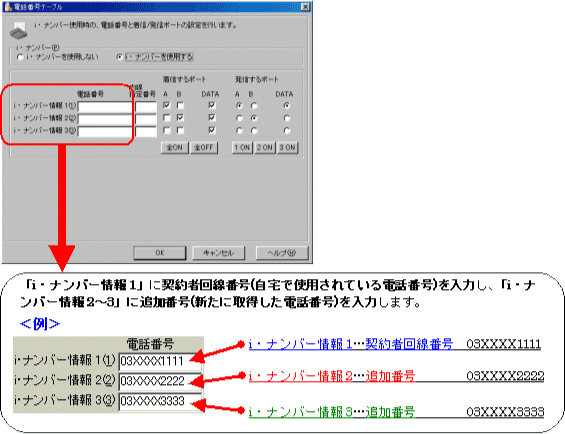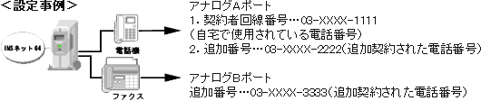 本画面では、事例として次のように電話番号を割り振る設定方法を記載しています。 設定する際には、ご利用になる環境に読み替えて、実際にご利用の電話番号にて設定してください。