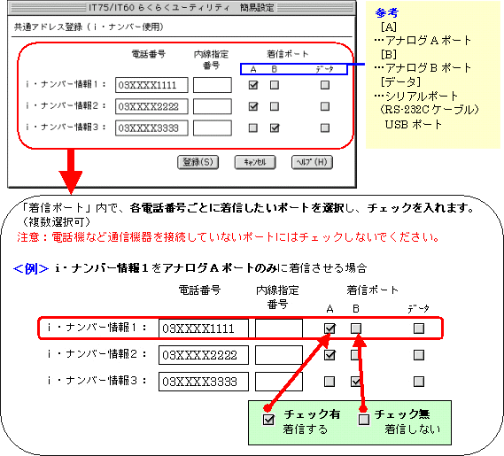 本画面では、事例として次のように電話番号を割り振る設定方法を記載しています。