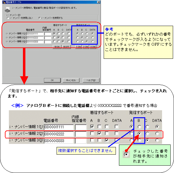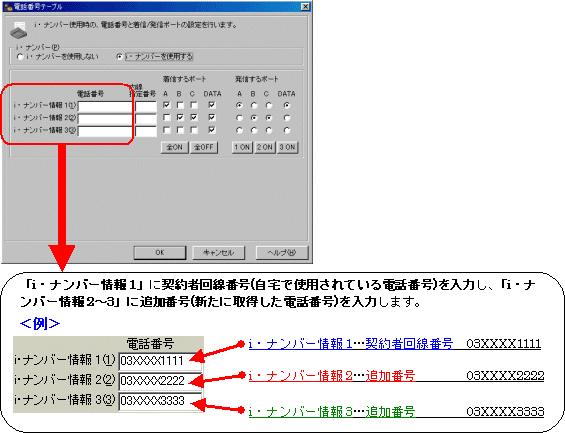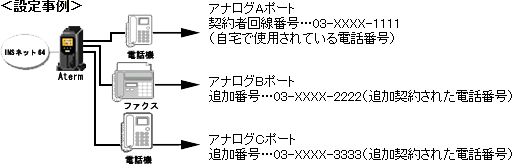 本画面では、事例として次のように電話番号を割り振る設定方法を記載しています。 設定する際には、ご利用になる環境に読み替えて、実際にご利用の電話番号にて設定してください。