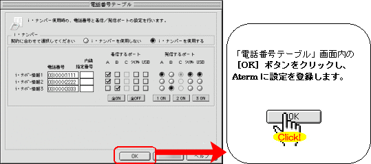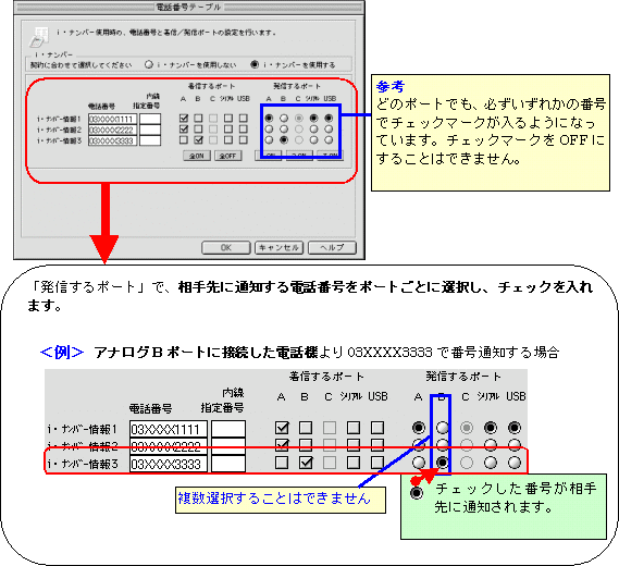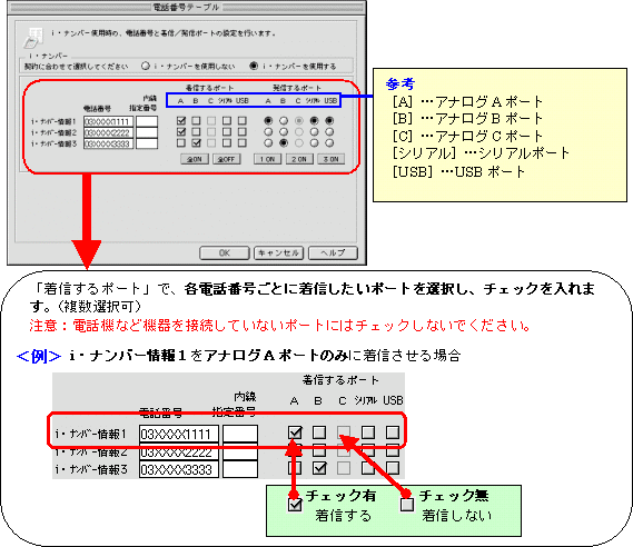 本画面では、事例として次のように電話番号を割り振る設定方法を記載しています。 設定する際には、ご利用になる環境に読み替えて、実際にご利用の電話番号にて設定してください。