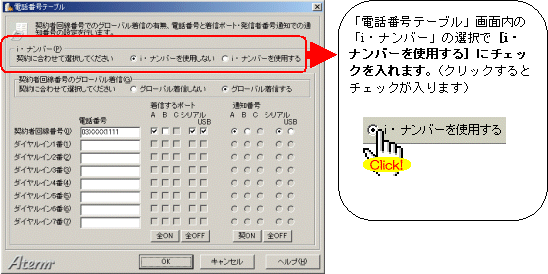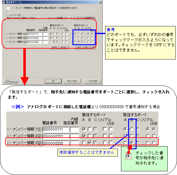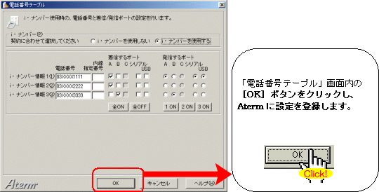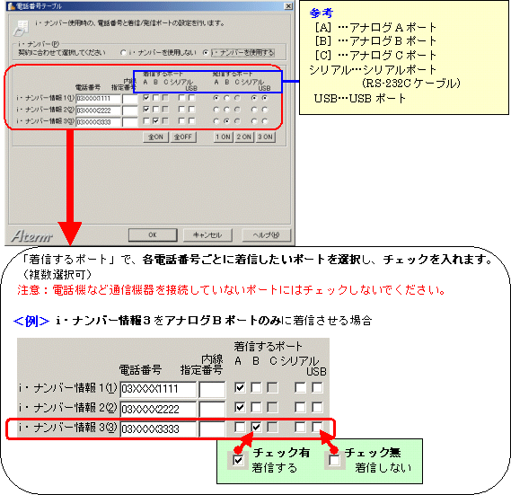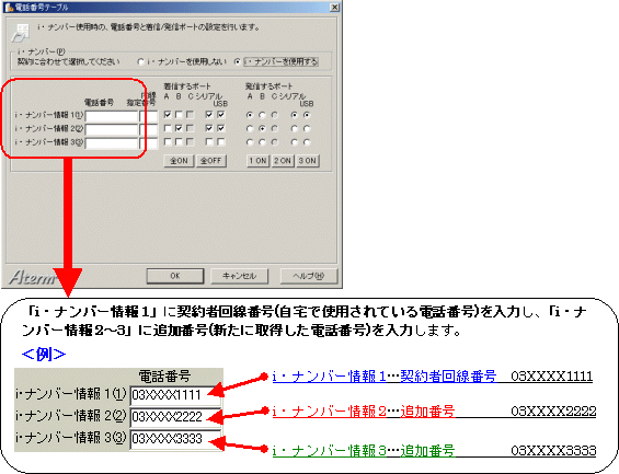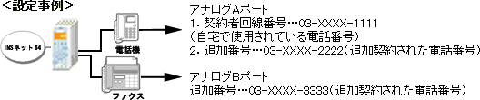 本画面では、事例として次のように電話番号を割り振る設定方法を記載しています。 設定する際には、ご利用になる環境に読み替えて、実際にご利用の電話番号にて設定してください。