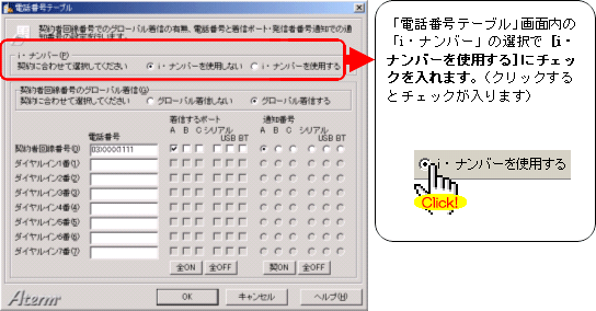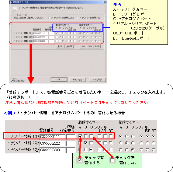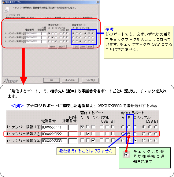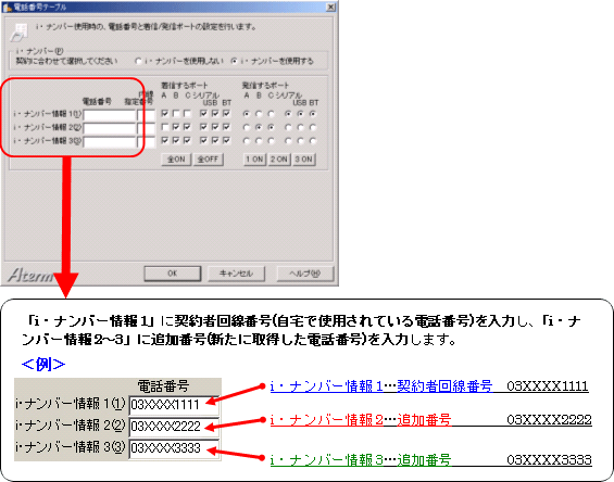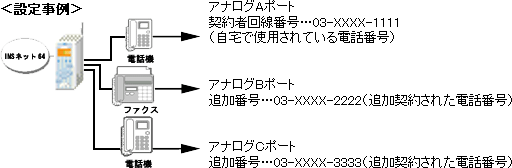 本画面では、事例として次のように電話番号を割り振る設定方法を記載しています。 設定する際には、ご利用になる環境に読み替えて、実際にご利用の電話番号にて設定してください。
