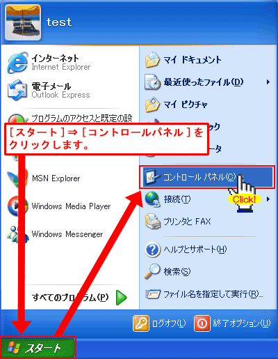 ※Windows 2000をご利用の場合は[スタート]-[設定]-[コントロールパネル]をクリックします。