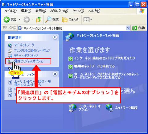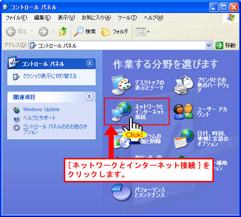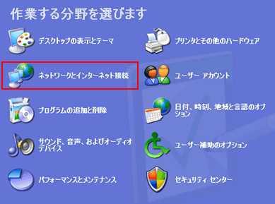 [スタート]-[コントロールパネル]-[ネットワークとインターネット接続]をクリックします。