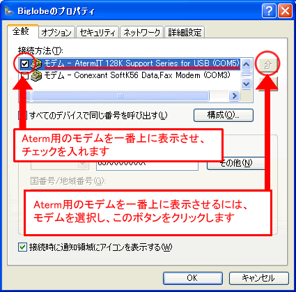 「全般」タブを開き「接続方法」でAterm用モデムを一番上に表示させ、チェックを入れます。