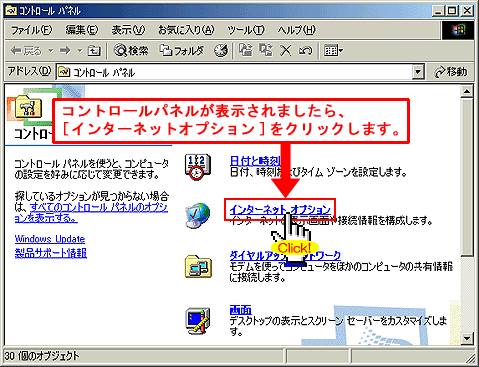 「すべてのコントロールパネルのオプション」が選択されている場合や、Windows(R) 98/98SE/2000の場合は、[インターネットオプション]のアイコンをダブルクリックします。 |