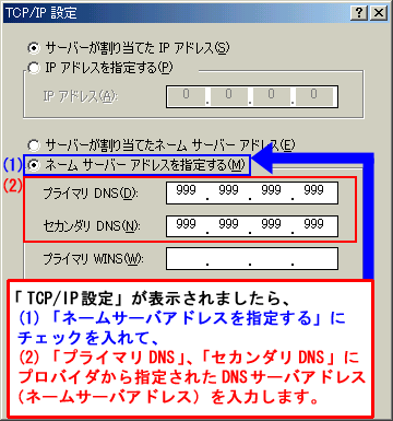プロバイダによってはDNSサーバアドレスの指定が1つだけの場合があります。