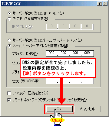 通常、DNSサーバアドレスは「999.999.999.999(3桁の数字4組)」の形式で指定します。