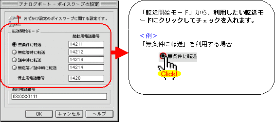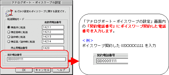 本画面では、事例として次のような設定方法を記載しています。 設定する際には、ご利用になる環境に読み替えて、実際にご利用の電話番号にて設定してください。