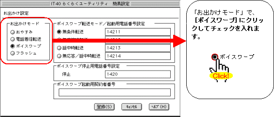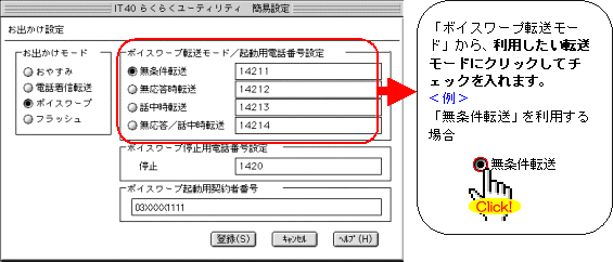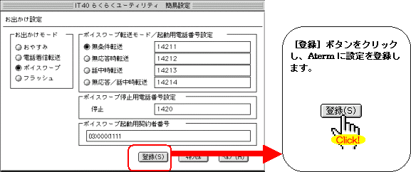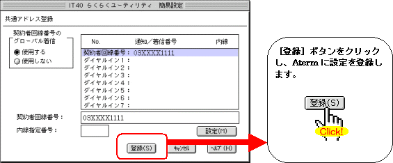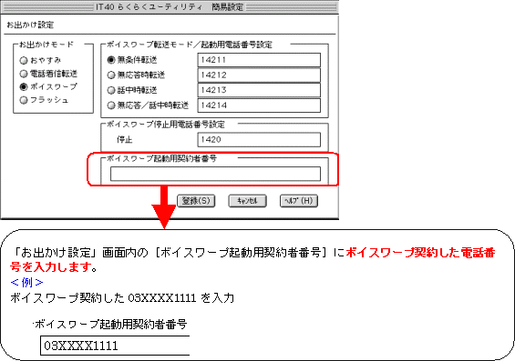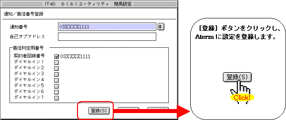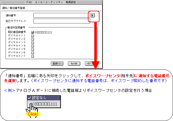 本画面では、事例として次のような設定方法を記載しています。 設定する際には、ご利用になる環境に読み替えて、実際にご利用の電話番号にて設定してください。
