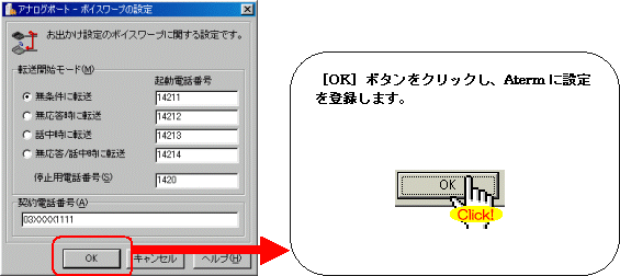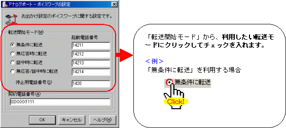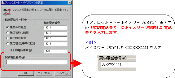 本画面では、事例として次のような設定方法を記載しています。 設定する際には、ご利用になる環境に読み替えて、実際にご利用の電話番号にて設定してください。