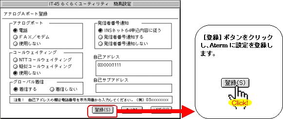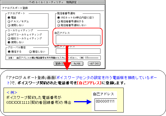 本画面では、事例として次のような設定方法を記載しています。 設定する際には、ご利用になる環境に読み替えて、実際にご利用の電話番号にて設定してください。