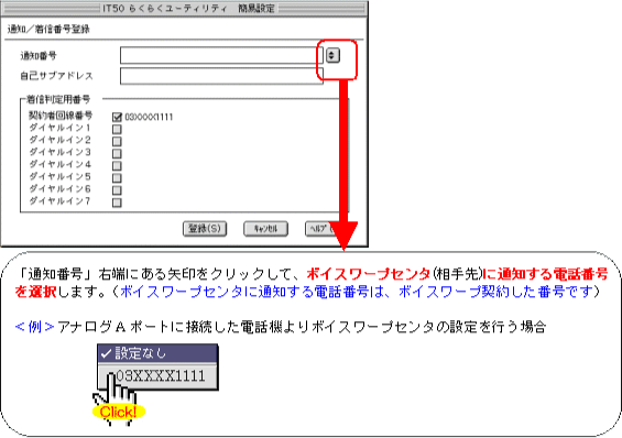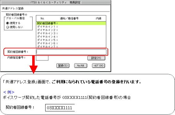 本画面では、事例として次のような設定方法を記載しています。 設定する際には、ご利用になる環境に読み替えて、実際にご利用の電話番号にて設定してください。