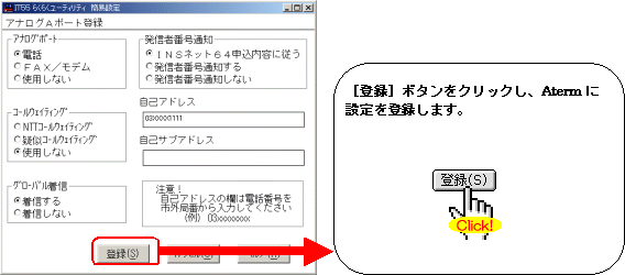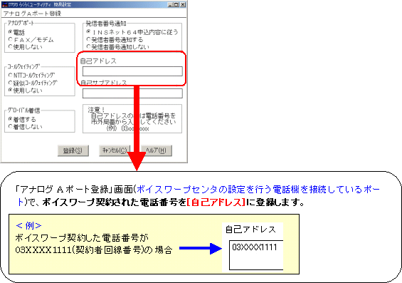 本画面では、事例として次のような設定方法を記載しています。 設定する際には、ご利用になる環境に読み替えて、実際にご利用の電話番号にて設定してください。