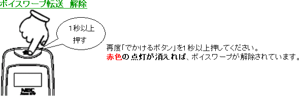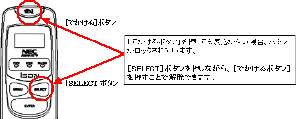 下記の操作を行うと「でかけるボタン」が赤色に点灯し、Atermがボイスワープセンタに自動的に電話をかけ、ボイスワープが開始されます。