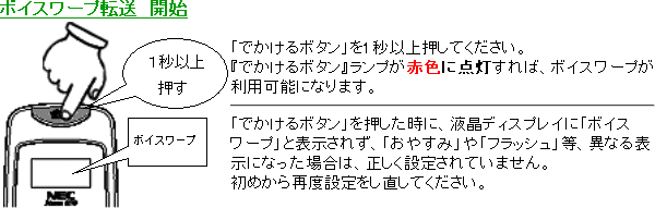【操作内容】 実際にボイスワープを利用するときに下記の操作を行います。 下記の操作を行うと「でかけるボタン」が赤色に点灯し、Atermがボイスワープセンタに自動的に電話をかけ、ボイスワープが開始されます。
