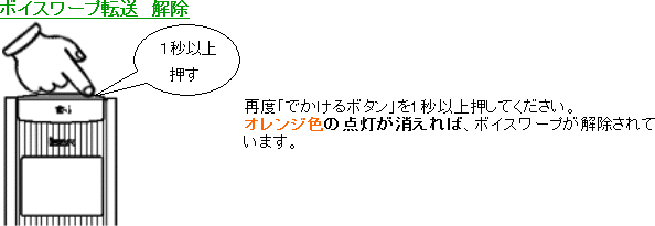 【操作内容】 実際にボイスワープを利用するときに下記の操作を行います。 下記の操作を行うと「でかけるボタン」がオレンジ色に点灯し、Atermがボイスワープセンタに自動的に電話をかけ、ボイスワープが開始されます。