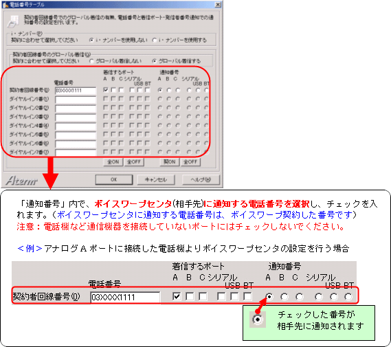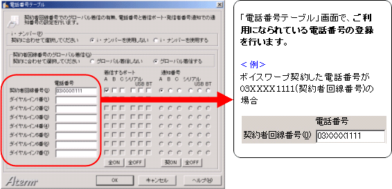 本画面では、事例として次のような設定方法を記載しています。 設定する際には、ご利用になる環境に読み替えて、実際にご利用の電話番号にて設定してください。