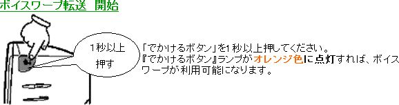 下記の操作を行うと「でかけるボタン」がオレンジ色に点灯し、Atermがボイスワープセンタに自動的に電話をかけ、ボイスワープが開始されます。