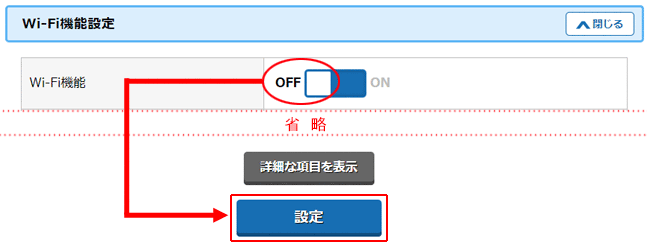 - 「Wi-Fi詳細設定」には、「2.4GHz」と「5GHz」があります。両方のセカンダリSSIDを停止する場合は、それぞれに設定を行ってください